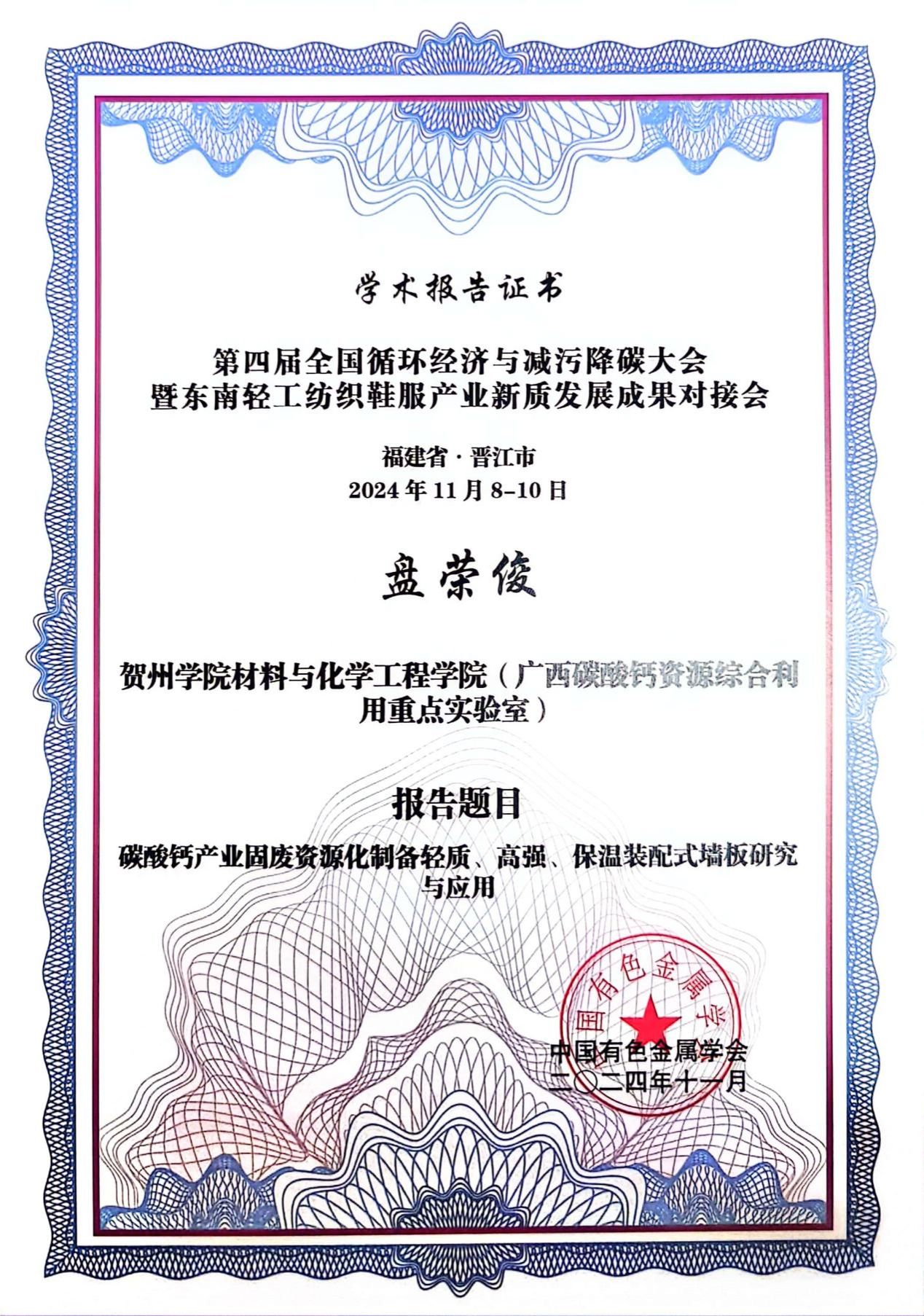 2024年11月8日—10日,由国家自然科学基金委员会工程与材料科学部指导,中国有色金属学会、中国科学院过程工程研究所等单位联合主办的第四届全国循环经济与减污降碳大会在福建省晋江市召开。